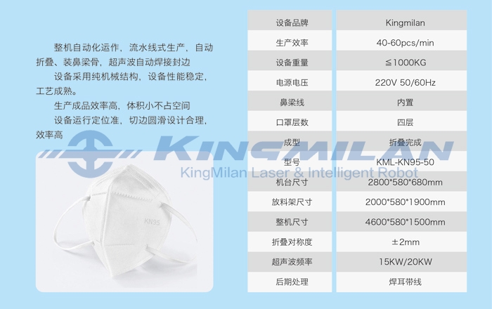 整機自動化運作,流水線式生產(chǎn),自動折疊、裝鼻梁骨,超聲波自動焊接封邊 設備采用純機械結構,設備性能穩(wěn)定,工藝成熟. 生產(chǎn)成品效率高,體積小不占空間設備運行定位準,切邊圓滑設計合理,效率高